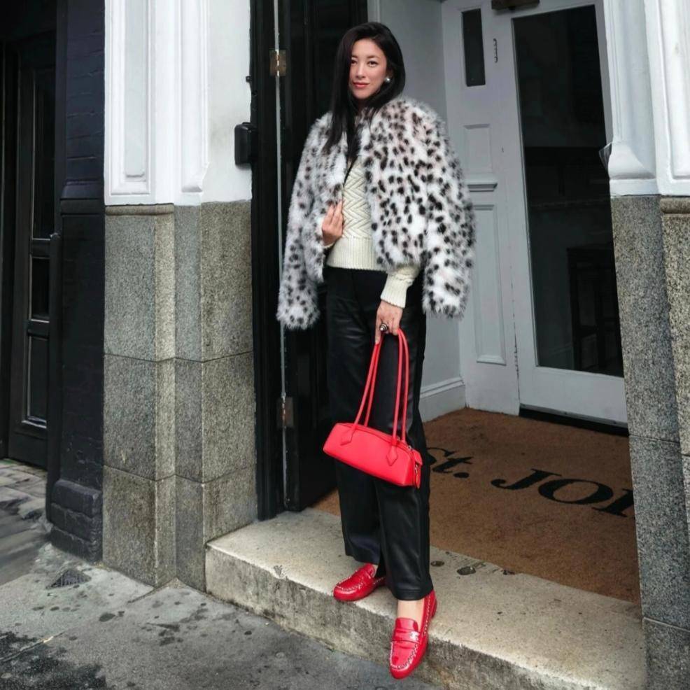 还好她选择的是廓形豹纹毛毛外套,这种款式显瘦效果显著,能够有效修饰肩宽等问题。高腰款则可以进一步拉高比例,小个子搭配得当,便能营造出腰以下全是腿 的视觉效果。